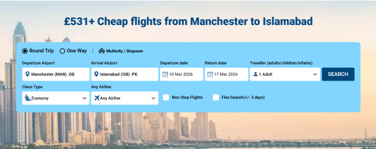 Find affordable flights from Manchester to Islamabad with flexible travel options and competitive fares. Compare airlines, choose one-way or return tickets, and enjoy a smooth booking experience for your next trip to Pakistan with reliable travel support and great deals.